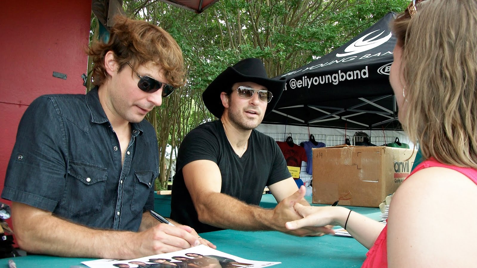 The Lost Trailers were scheduled to perform at 2:30, so we got there around 2:00. As we sat there, and sat there, and sat there some more we finally heard they were running an hour being - pretty unusual for a country concert. They're usually very punctual. And I was amazed at how empty the place was. I don't know if it was the heat that kept people away or what, but I don't think I've ever seen it that empty before. Finally at 3:30 they took the stage and they were, as always, fabulous!! We loved every minute of their set and were close enough to make eye contact. It was awesome! Cari, of course, knew every word to every song.After their set Ryder announced they'd be signing autographs at the Merchandise Booth. Needless to say, we immediately got up and proceeded to find the Merchandise Booth and get in line. We each bought a group photo and got it personalized, then got our photos taken with Ryder and Stokes.